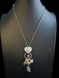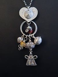 Heart charm necklace embellished with tibetan silver bead, Hmong amulet, heart, bell, tiger eye and rutiled quartz on a 20 inch sterling silver rolo chain.