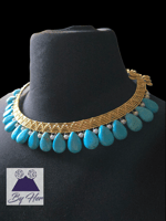 This beautiful handcrafted choker-style necklace with a wide, structured band is made of tightly woven gold-tone wire. It's edged with simulated pearls and tear drop shaped Howlite stones.