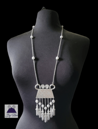 Simple amulet necklace embellished with simulated pearls and hmong tassel on a decorative beaded stardust chain necklace. Necklaces measure approximately 30 inches in length with a 4 inches extender; lobster clasp