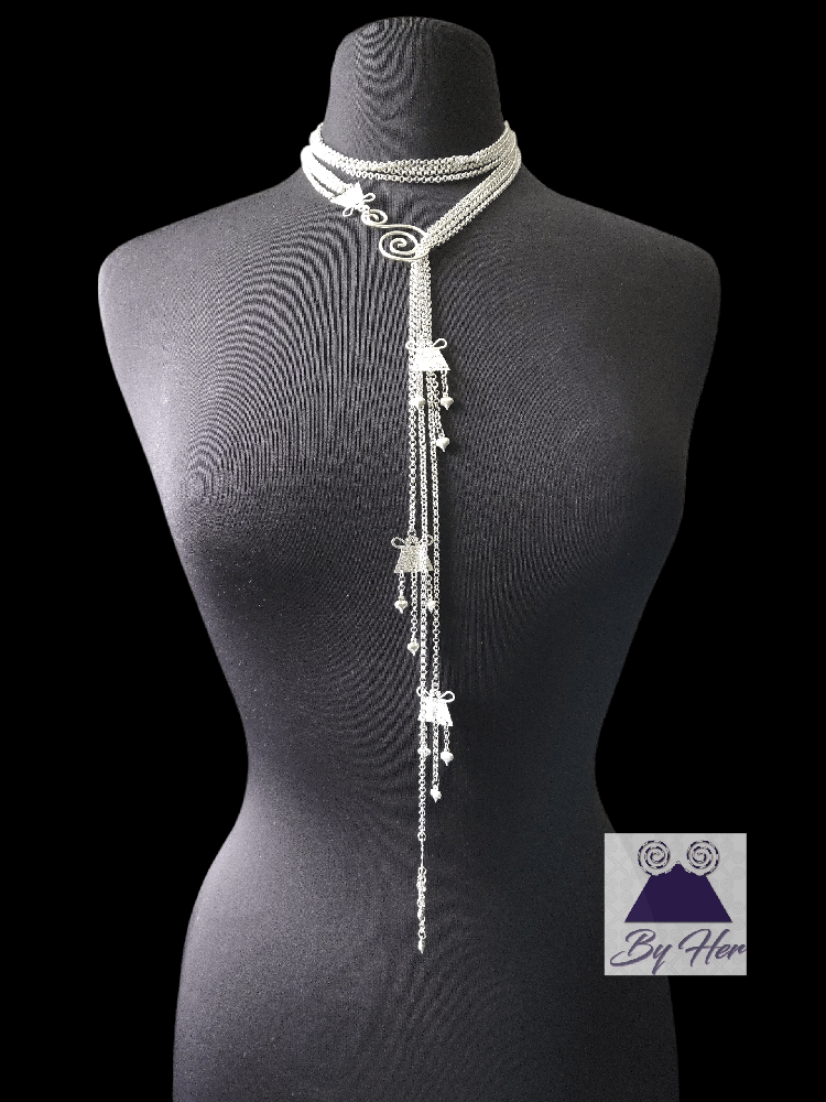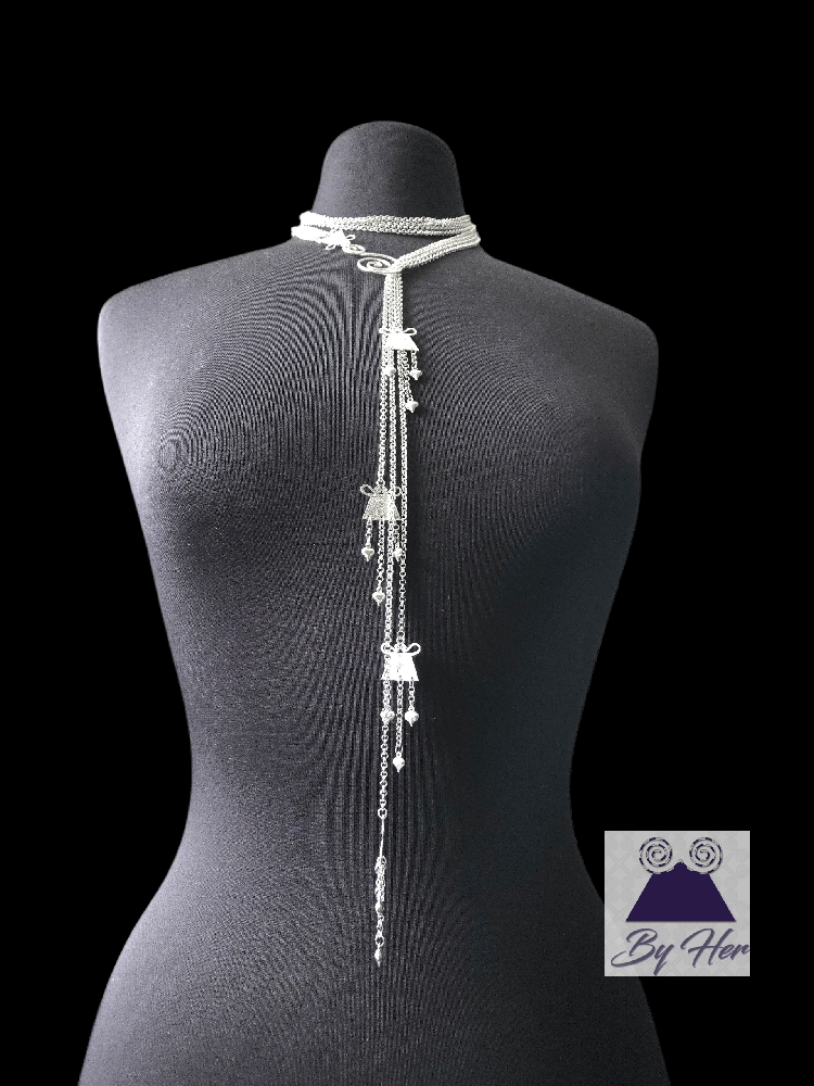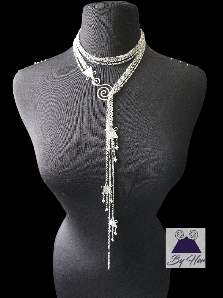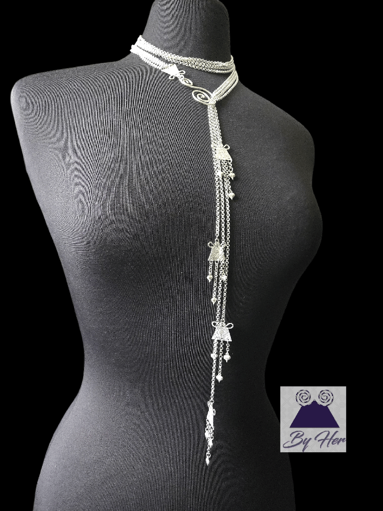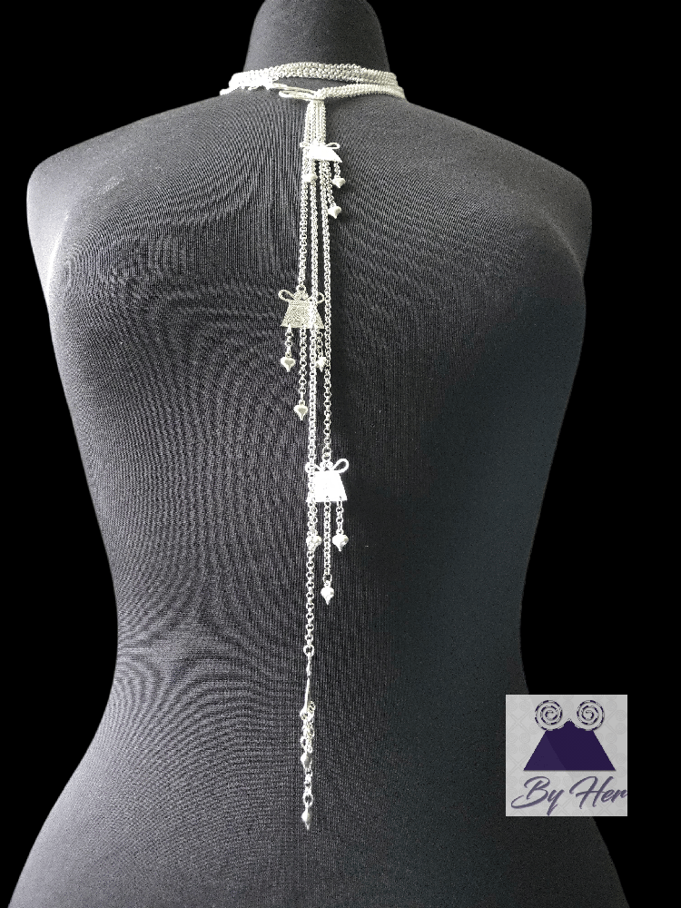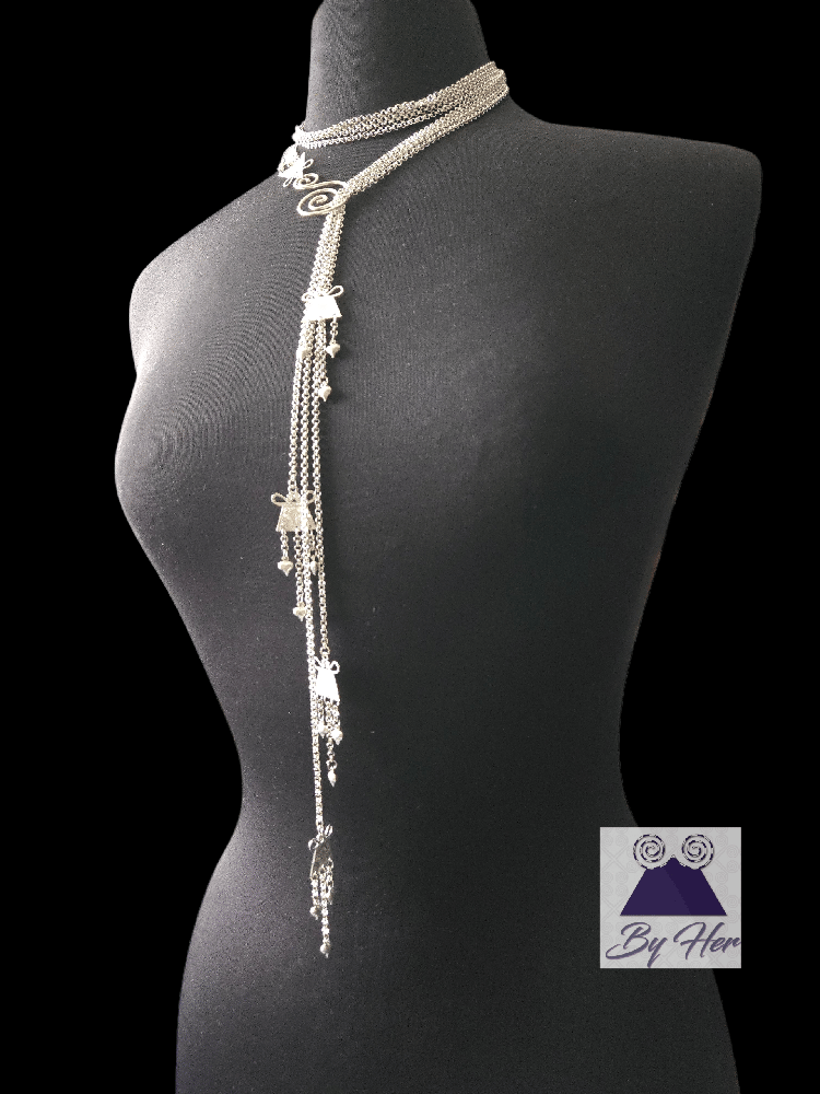 Wrap lariat style necklace with a large S swirl embellished with Hmong amulet and heart charms. The longest strand is approximately 44" in length