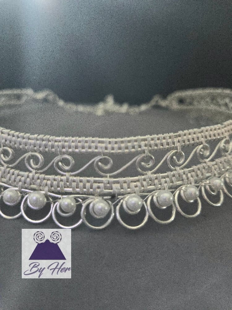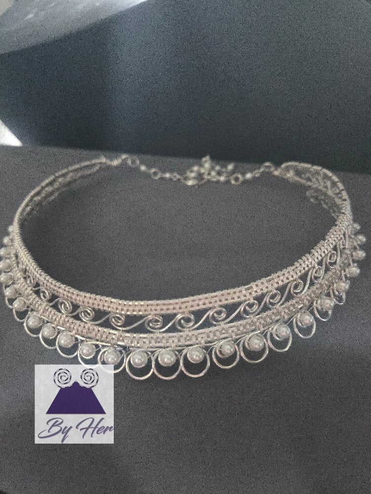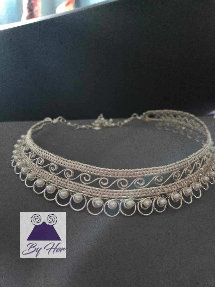 This beautiful choker is handcrafted with intricate wire-wrapped details filigree hmong swirl motif and small simulated pearl embellishments. The design is giving a vintage, bohemian and traditional Indian aesthetic.