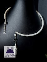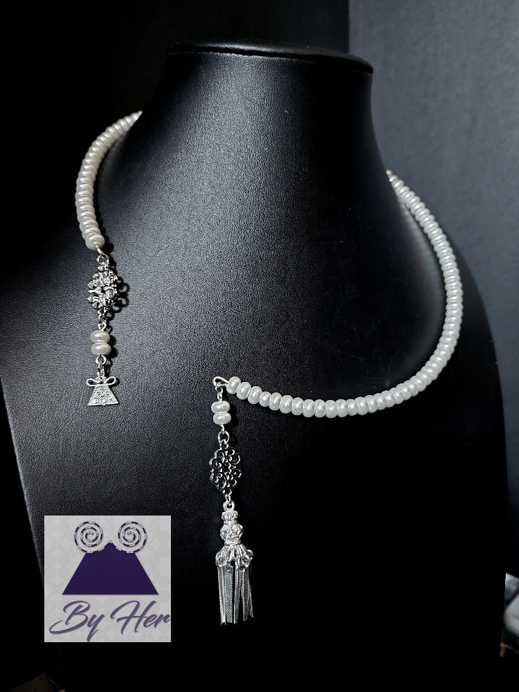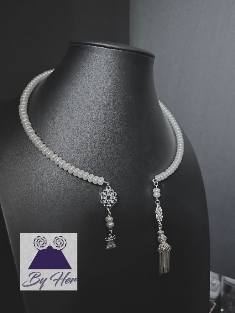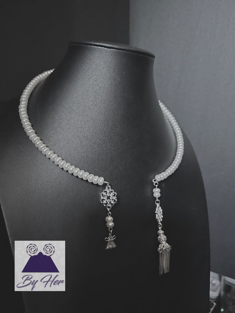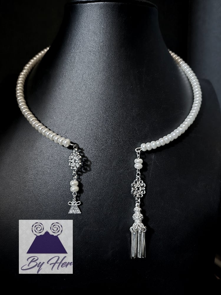 Beautiful necklace composed of white glass beads on silver plated stainless steel memory wires with an Hmong mini pendant and tassel charms. Necklace is free size and will fit up to 18 inches